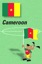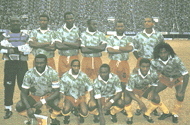Cameroon Position Dress # Club ----------------------------- -------- ------- ---- Agbo, Hans DEF 15 Olympique de Mvolye Bell, Joseph-Antoine GK 1 St. Etienne (Fra) Ekeme Ndiba, Samuel DEF 4 Canon Yaound� Emb�, David FWD 19 Bellenese (Por) Fiala Fiala, Jean MID 18 Canon Yaound� Foe, Marc Vivien FWD 17 Canon Yaound� Kalla Nkongo, Raymond DEF 13 Canon Yaound� Kana Biyick, Andr� MID 2 Le Havre (Fra) Libiih, Thomas MID 6 O.C. Medine Loga, Paul MID 12 Pr�voyance Yaound� Maboang Kessack, Emmanuel DEF 11 Rio Avenue (Por) Mbouh Mbouh, Emile MID 8 Nadi Qatar (Qat) Mfede, Louis FWD 10 Canon Yaound� Milla, Roger FWD 9 Tonnerre Yaound� Mouyeme, Georges FWD 20 Troyes (Fra) N'Dip Akem, Victor DEF 5 Olympic Mvoly� N'Kono, Thomas GK 21 Hospitalet (Esp) Omam-Biyick, Fran�ois FWD 7 R.C. Lens (Fra) Song Bahanag, Rigobert DEF 3 Tonnerre Yaound� Songo'o, Jacques Celestin GK 22 F.C. Metz (Fra) Tataw Eta, Stephen DEF 14 Olympic Mvoly� Tchami, Alphonse FWD 16 OB Odense (Den)