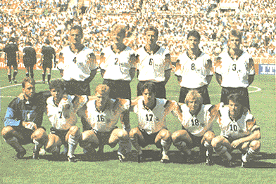 Germany Position Dress # Club ----------------------------- -------- ------- ---- Basler, Mario MID 21 Werder Bremen Berthold, Thomas DEF 14 VfB Stuttgart Brehme, Andreas DEF 3 Kaiserslautern Buchwald, Guido DEF 6 VfB Stuttgart Effenberg, Stefan MID 20 Fiorentina (Ita) Gaudino, Maurizio MID 15 Eintracht Frankfurt H�ssler, Thomas MID 8 Roma (Ita) Helmer, Thomas DEF 5 Bayern Munich Illgner, Bodo GK 1 Cologne Kahn, Oliver GK 22 Karlsruher Kirsten, Ulf FWD 19 Bayer Leverkusen Klinsmann, J�rgen FWD 18 AS Monaco (Fra) Kohler, J�rgen DEF 4 Juventus (Ita) K�pke, Andreas GK 12 N�rnberg Kuntz, Stefan FWD 11 Kaiserslautern Matth�us, Lothar DEF 10 Bayern Munich M�ller, Andreas MID 7 Juventus (Ita) Riedle, Karlheinz FWD 9 Borussia Dortmund Sammer, Matthias MID 16 Borussia Dortmund Strunz, Thomas DEF 2 VfB Stuttgart V�ller, Rudolf FWD 13 Marseille (Fra) Wagner, Martin DEF 17 Kaiserslautern